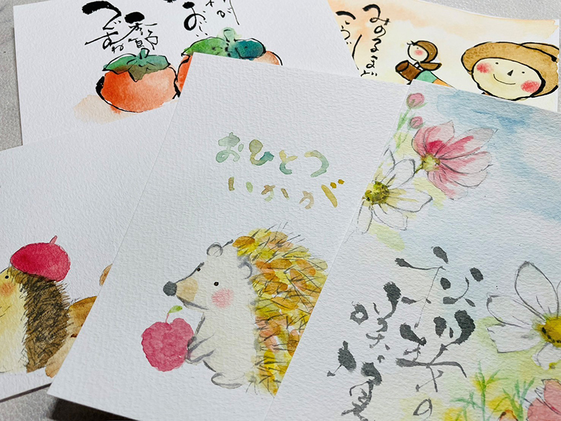 季節の水彩画に筆ペンを使って筆文字で言葉を添えて書いていきます。初めての方でも描ける素材を用意してますので安心して受けていただけます。